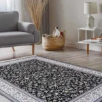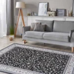 Give your room rich depth with the Amatis Adrianna Navy Blue Rug. A dark navy field is filled with an all-over pattern of scrolling vines and petite florals, framed by layered borders in soft grey and ivory with delicate pastel highlights. The refined palette grounds a space while the intricate design adds movement and character.