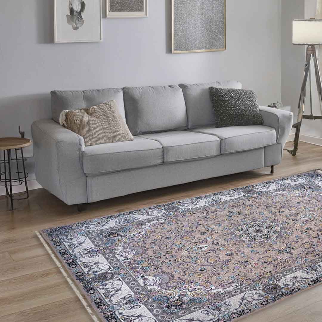 Warm up your space with the Amatis Pargol Beige Rug. A soft beige field holds a detailed floral medallion and scrolling vines, framed by layered borders in ivory and grey. Gentle touches of teal, rose and gold add quiet colour while the overall look stays calm and easy to style with neutral furnishings.
