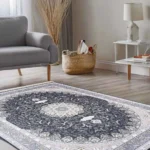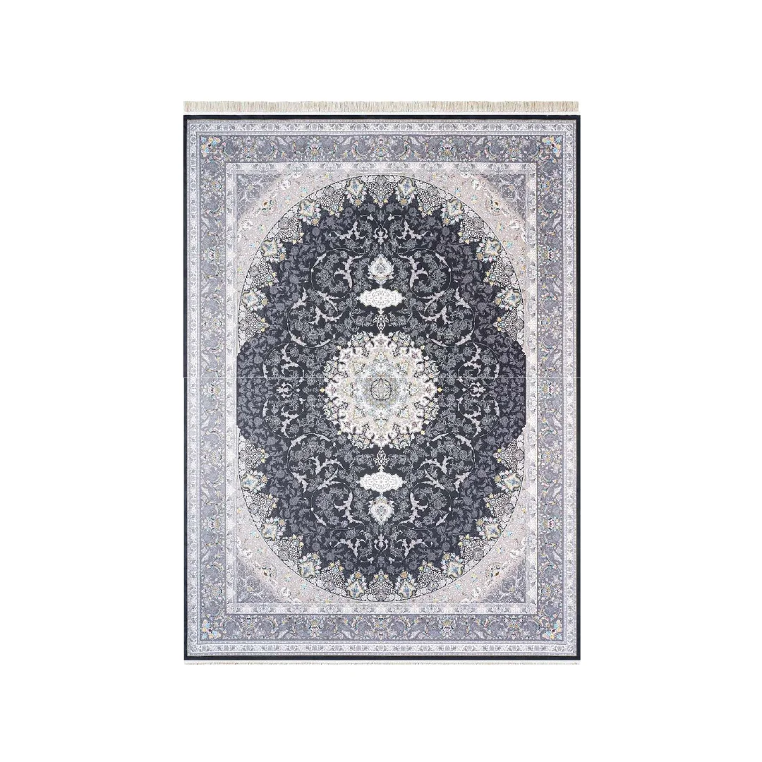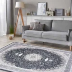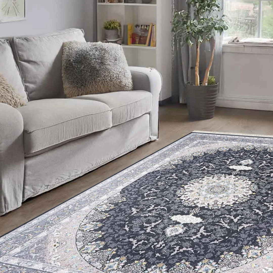 Make a confident style statement with the Sara Navy Blue Rug. A deep navy field showcases a finely detailed round medallion, set within an oval frame of scrolling florals and finished with layered borders in grey and ivory. The rich palette adds depth and definition while the classic pattern brings balance to modern and traditional rooms.
