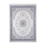 Brighten your space with the Amatis Sara White Rug. A clean white field centres a finely detailed floral medallion, framed by an oval garland of vines and layered borders in soft grey and ivory with gentle blue accents. The light palette opens up any room and the classic pattern adds calm structure that is easy to style.