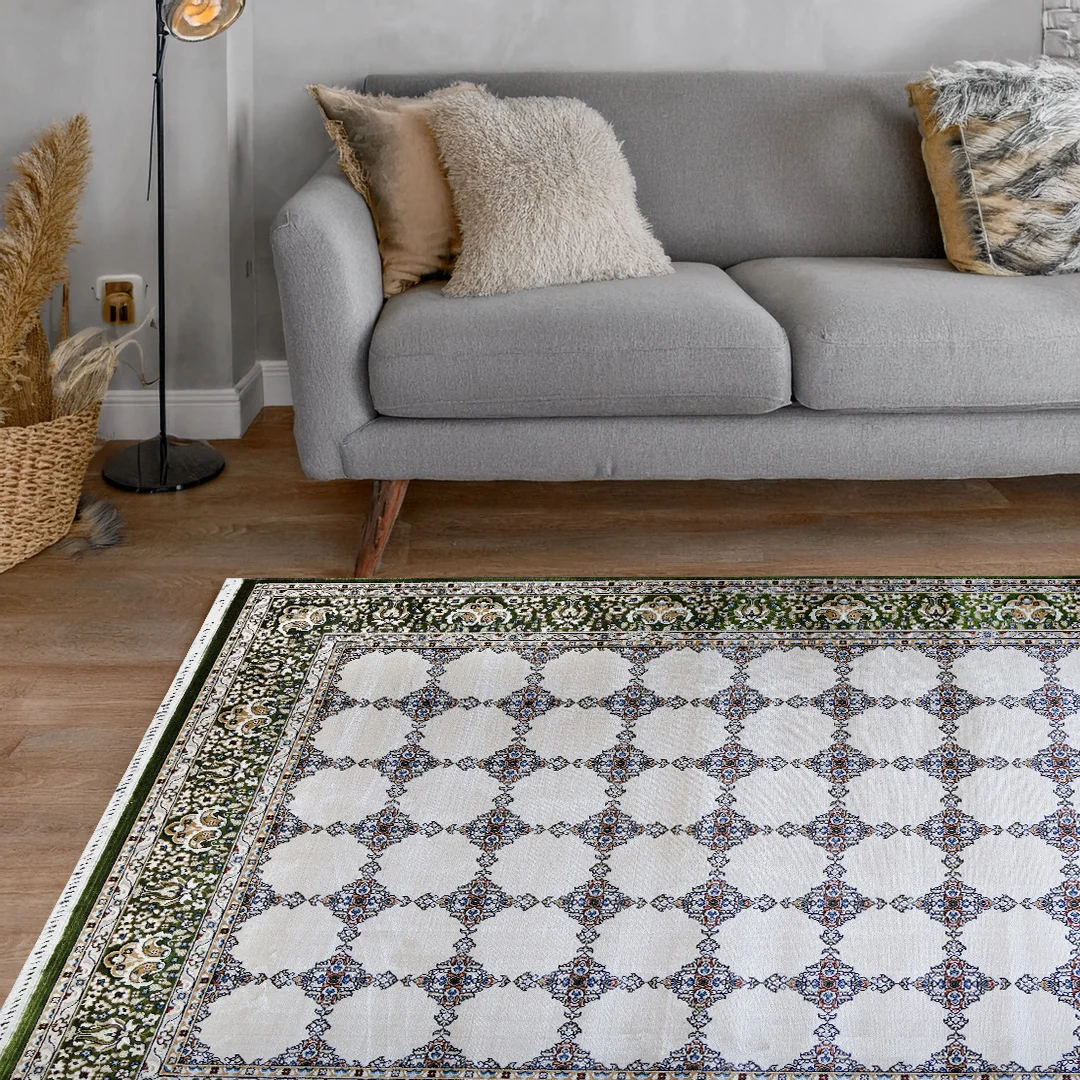 Add a refreshing twist to tradition with the Bukhara Green Beige Elegance Rug. Its soft beige centre is adorned with a symmetrical medallion layout, framed by a rich green floral border featuring accents of ivory, gold and navy. The blend of natural tones brings a sense of harmony and brightness to your living space.