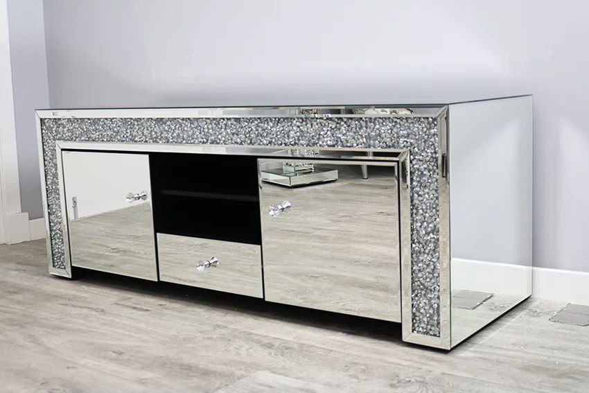 Mirrored TV Unit with diamond crushed edging with 2 doors and 1 drawer
