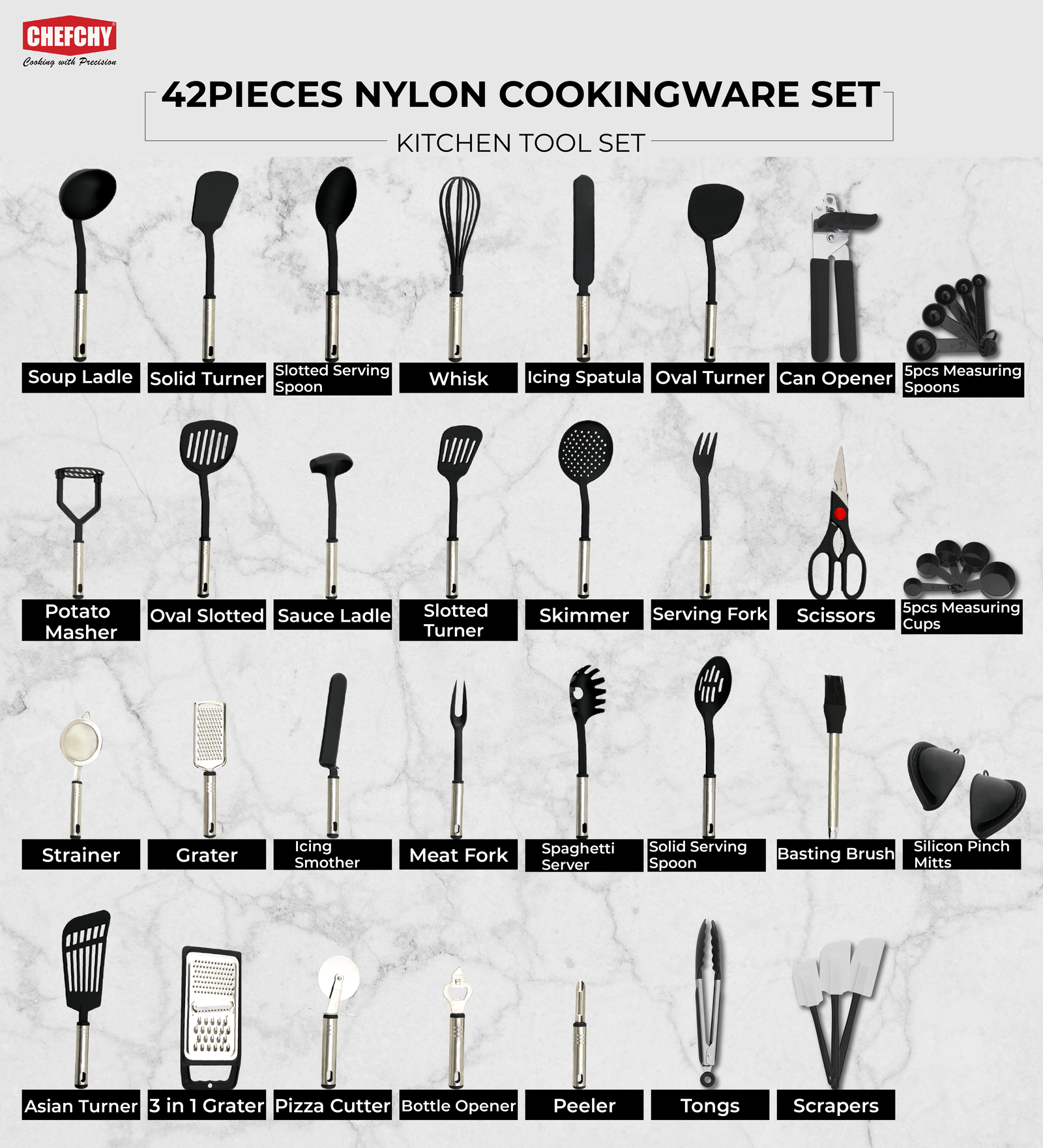 Have our CHEFCHY 42-Piece Kitchen Utensil Set. Matches perfectly with our utensil kitchenware knife range. Buy CHEFCHY 42-Piece Kitchen Utensil Set, a perfect addition in your kitchen that adds an elegant touch and also add a touch of your own style. All utensils come in an elegant and modern design, making them more than just a simple kitchen utensil, they are also a matching accessory for your kitchen. These are just a few options, though we have a lot to offer from our kitchenware selection.