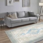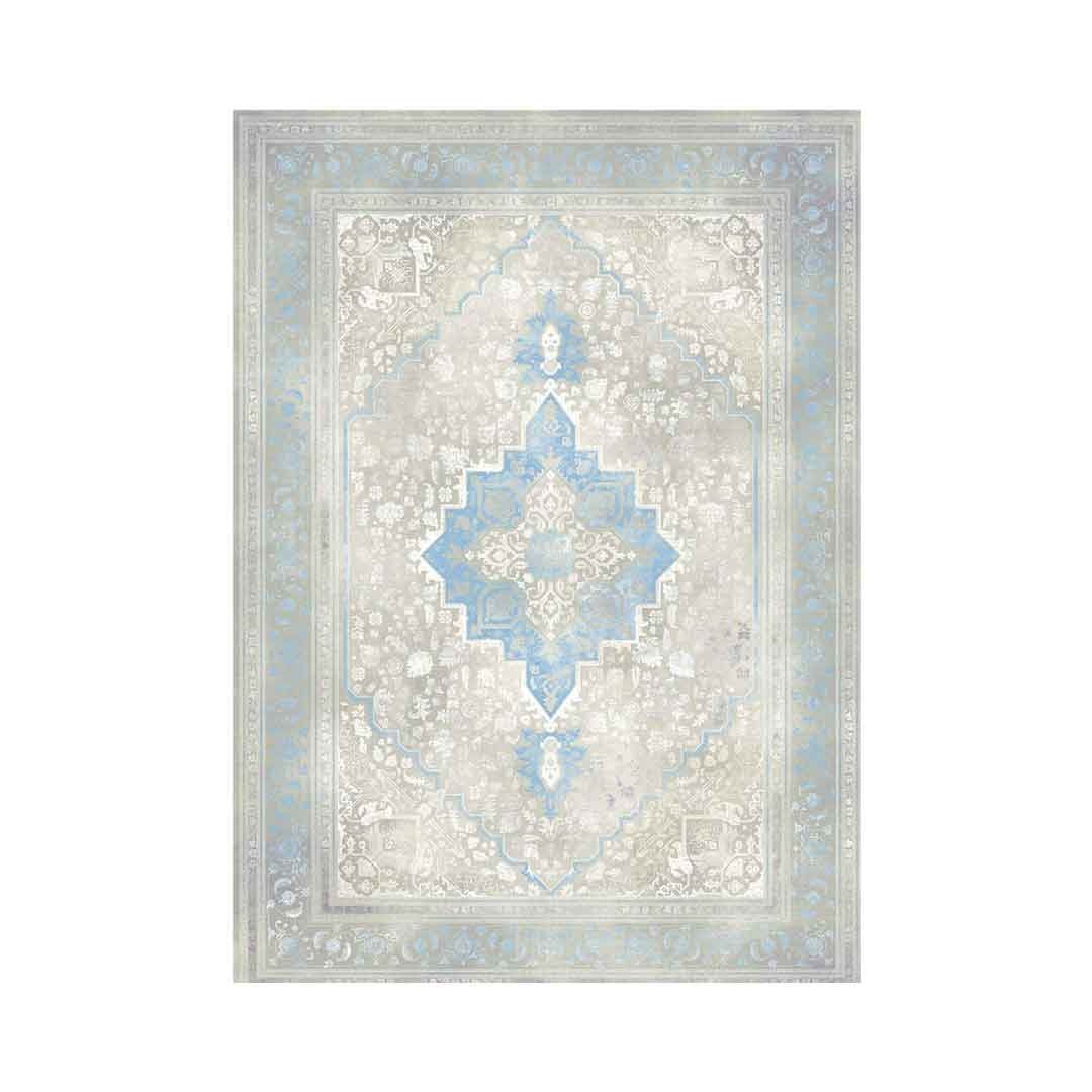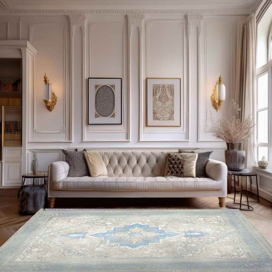 Lift your room with the cool tones of the Emerald Hirad Blue Rug. A light ivory ground showcases a stepped diamond medallion in fresh sky blue, framed by layered borders with delicate floral and geometric motifs. The airy palette brightens the space while the pattern brings gentle structure and interest.