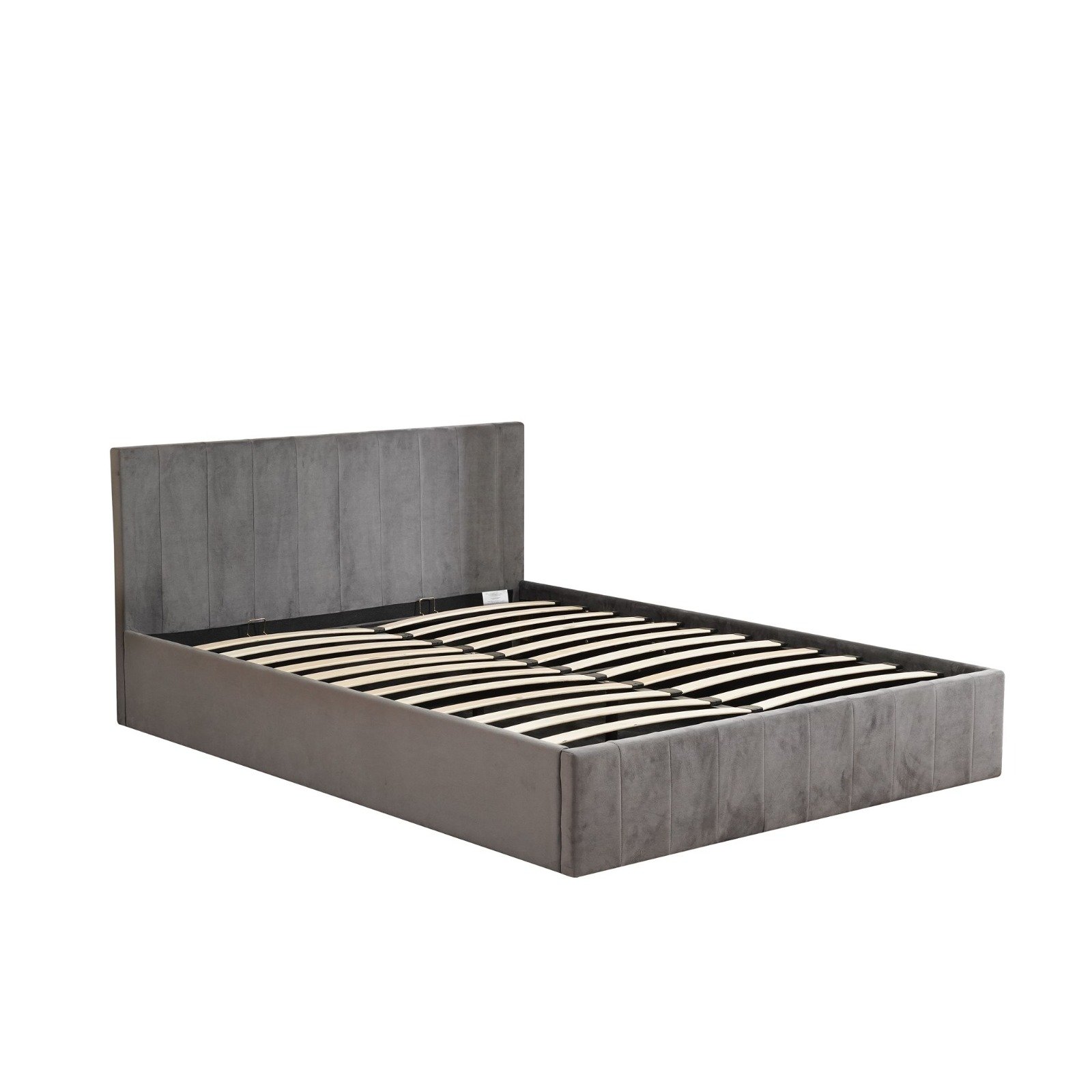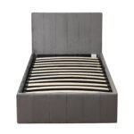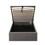 The Miami Ottoman Storage Bed is upholstered with a beautiful rich grey fabric arranged in slotted positions to add a touch of elegance and luxury to any bedroom.
