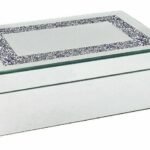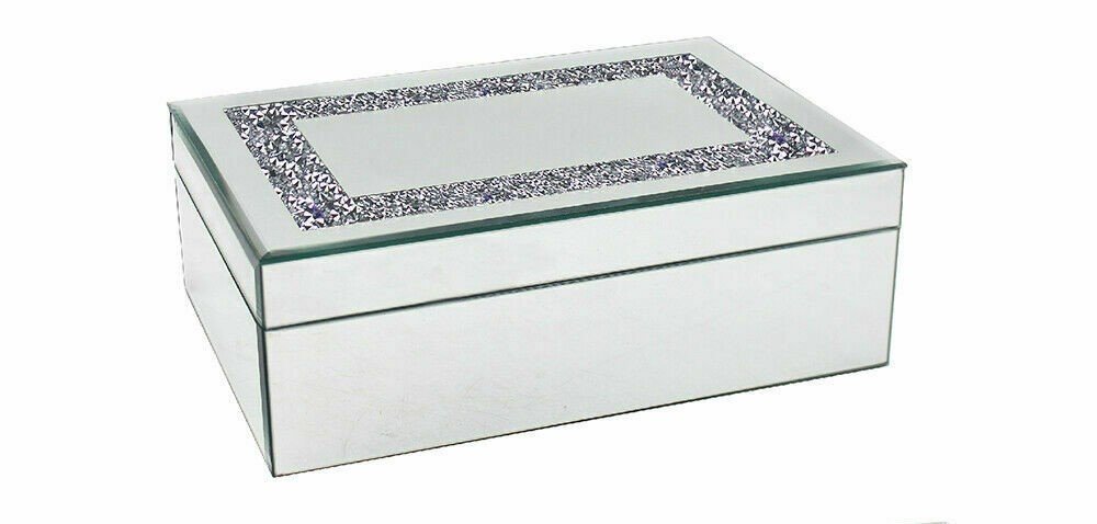 Buy Mirrored Crushed Glass Jewellery Box, it is a mirrored jewellery box with a diamond crush strip down the centre. The inside is lined with black velvet fabric for soft protection of all jewellery inside. It is perfect for your favourite jewels that hold them and keep them clutter-free in one place. A Mirrored Crushed Glass Jewellery Box, is also another option to bring a fashion into play. It is a mirrored jewellery box with a diamond-crush border along the centre. The inside is lined with black velvet fabric for soft protection of all jewellery inside. It is a modern minimalist design that is perfect for any vanity needs. Its diamond-crushed appearance adds a unique charm and makes it a perfect fit for your vanity. You can keep your jewellery in these jewellery boxes or use them to store your favourite watches too. In any of case, they are ready to bring charm to your home.